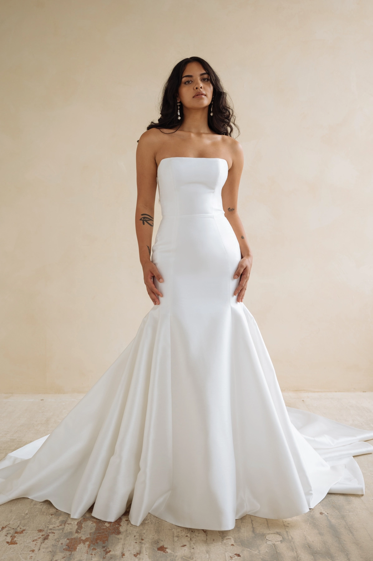 Das Lucia-Kleid aus unserem glänzend strukturierten Taft verleiht einer klassischen Silhouette eine dramatische Note. Ein schickes trägerloses Dekolleté geht über in einen ausgestellten, ausgestellten Rock, der am Ausschnitt extra ausgestellt ist, um Deine Figur zu betonen.
