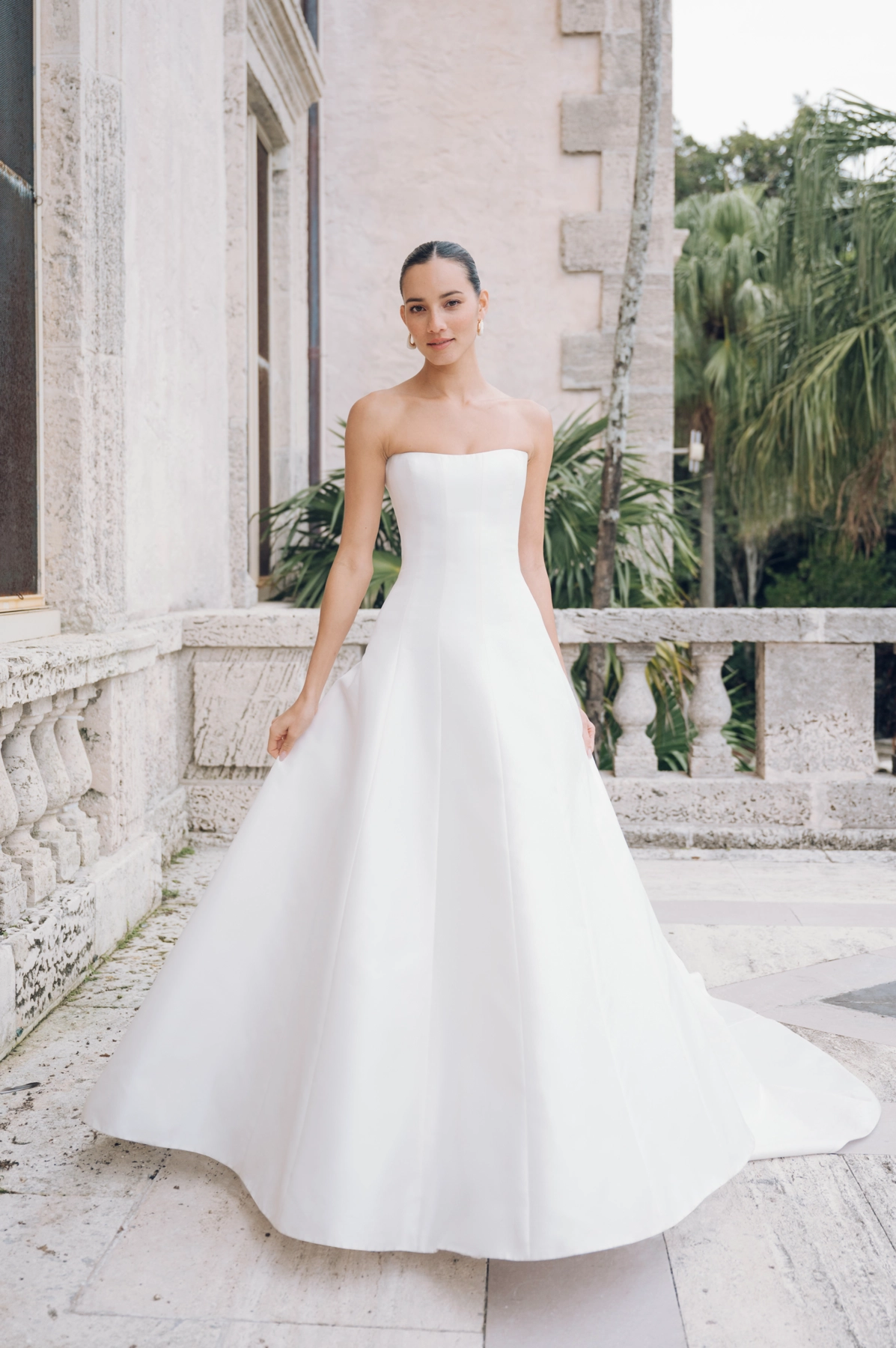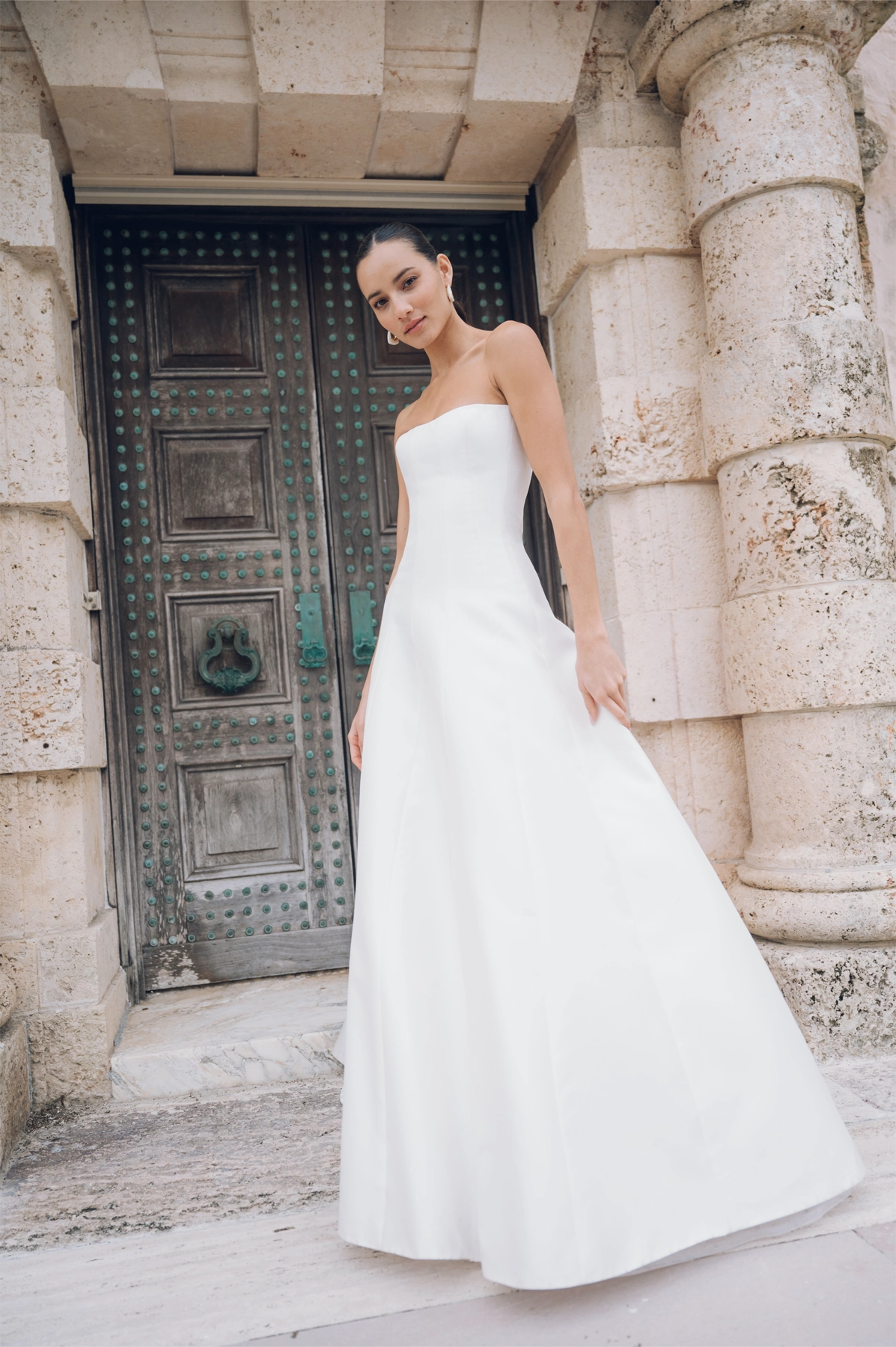 Das Kleid Sophia aus dem schimmernden neuen italienischen Taft besticht durch seine Schlichtheit und die Nahtdetails, die Deine Silhouette formen und verlängern. Verdeckte Knöpfe am Saum verleihen diesem modernen und doch zeitlosen Kleid ein klassisches Brautdetail.