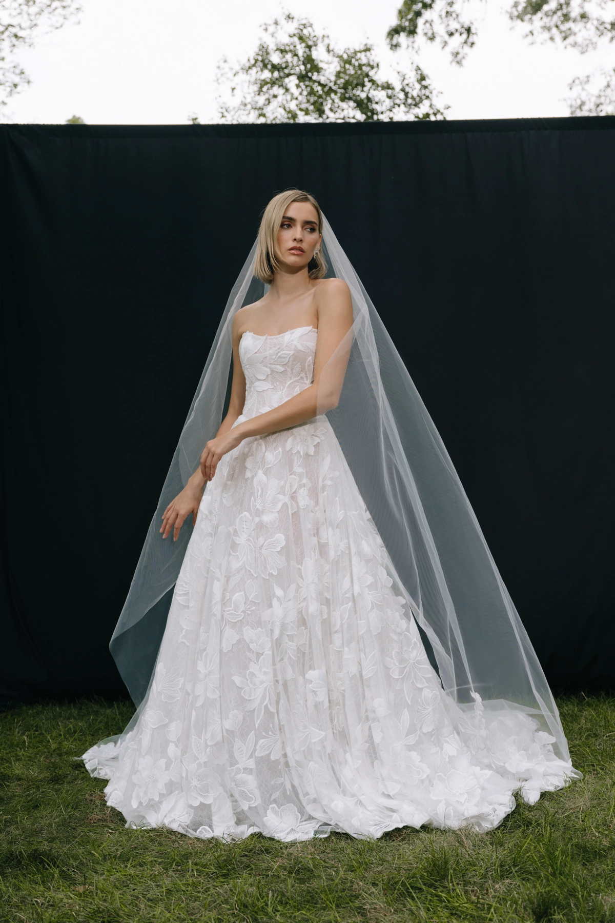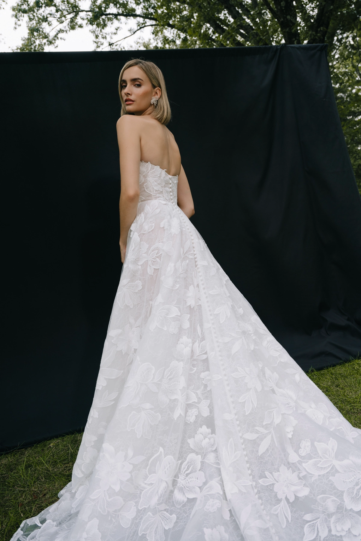 Ein liebevoll gestaltetes Illusion‑Tüll‑Rückendetail mit dekorativen Knöpfen setzt feminine Akzente und sorgt für einen wunderschönen Blick von hinten. Der Rock kann aus mehreren Lagen zarten Tülls bestehen, die dem Kleid Volumen verleihen, ohne an Leichtigkeit zu verlieren.